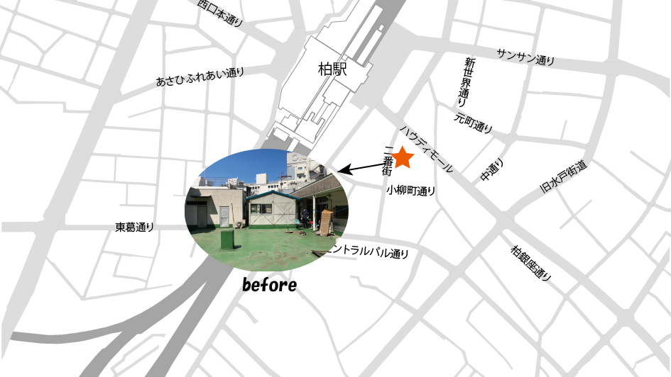 ‍柏セントラルには多くの建物が立ち並んでおり、新たに広場や公園のようなパブリックスペースを確保することは難しい状況です。